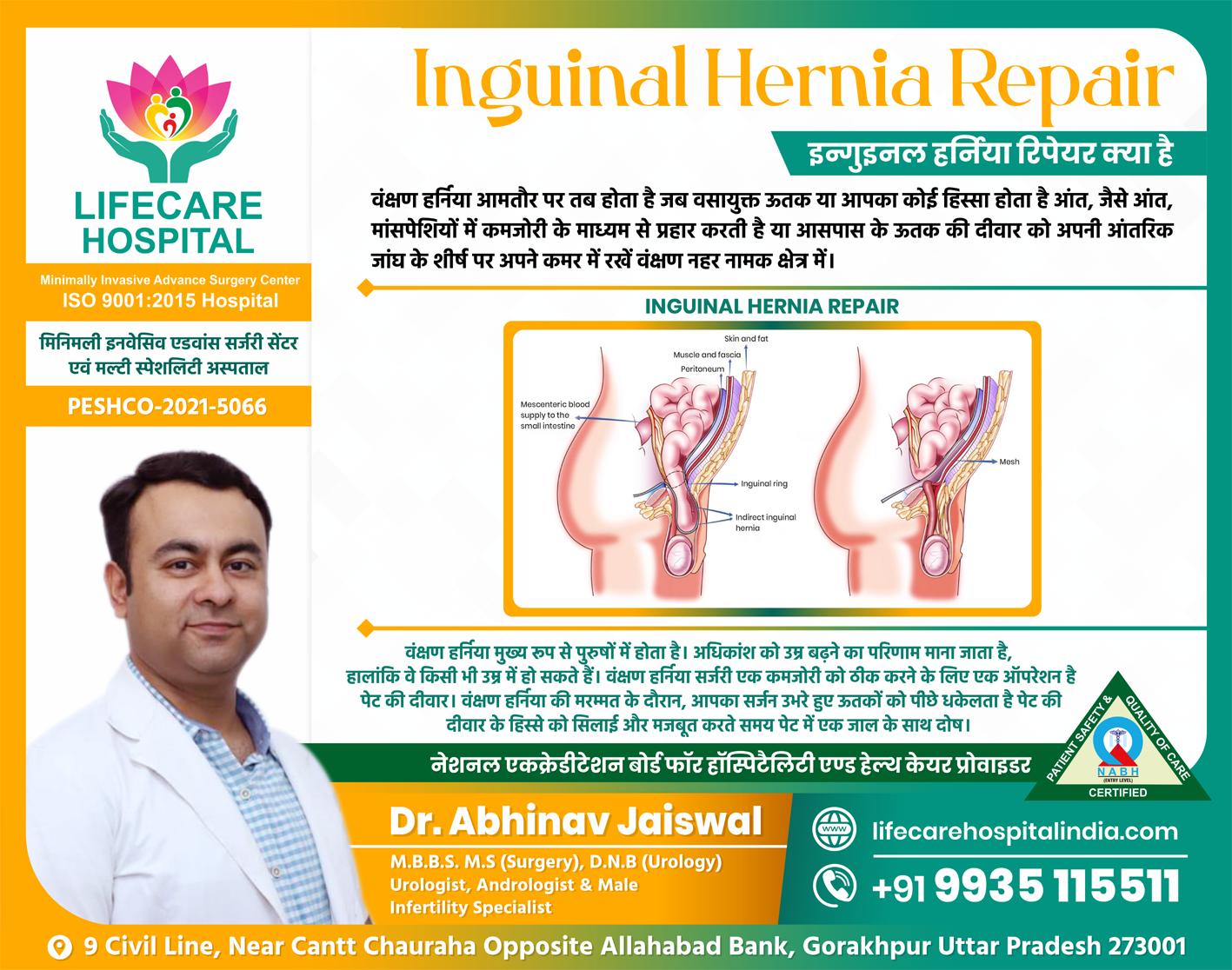 During inguinal hernia repair, your surgeon pushes the bulging tissues back into the abdomen while stitching and reinforcing the portion of the abdominal wall containing the defect with a mesh. This procedure is also known as inguinal Hernioplasty.