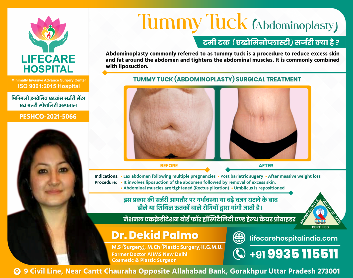 Abdominoplasty commonly referred to as tummy tuck is a procedure to reduce excess skin and fat around the abdomen and tightens the abdominal muscles. It is commonly combined with liposuction.