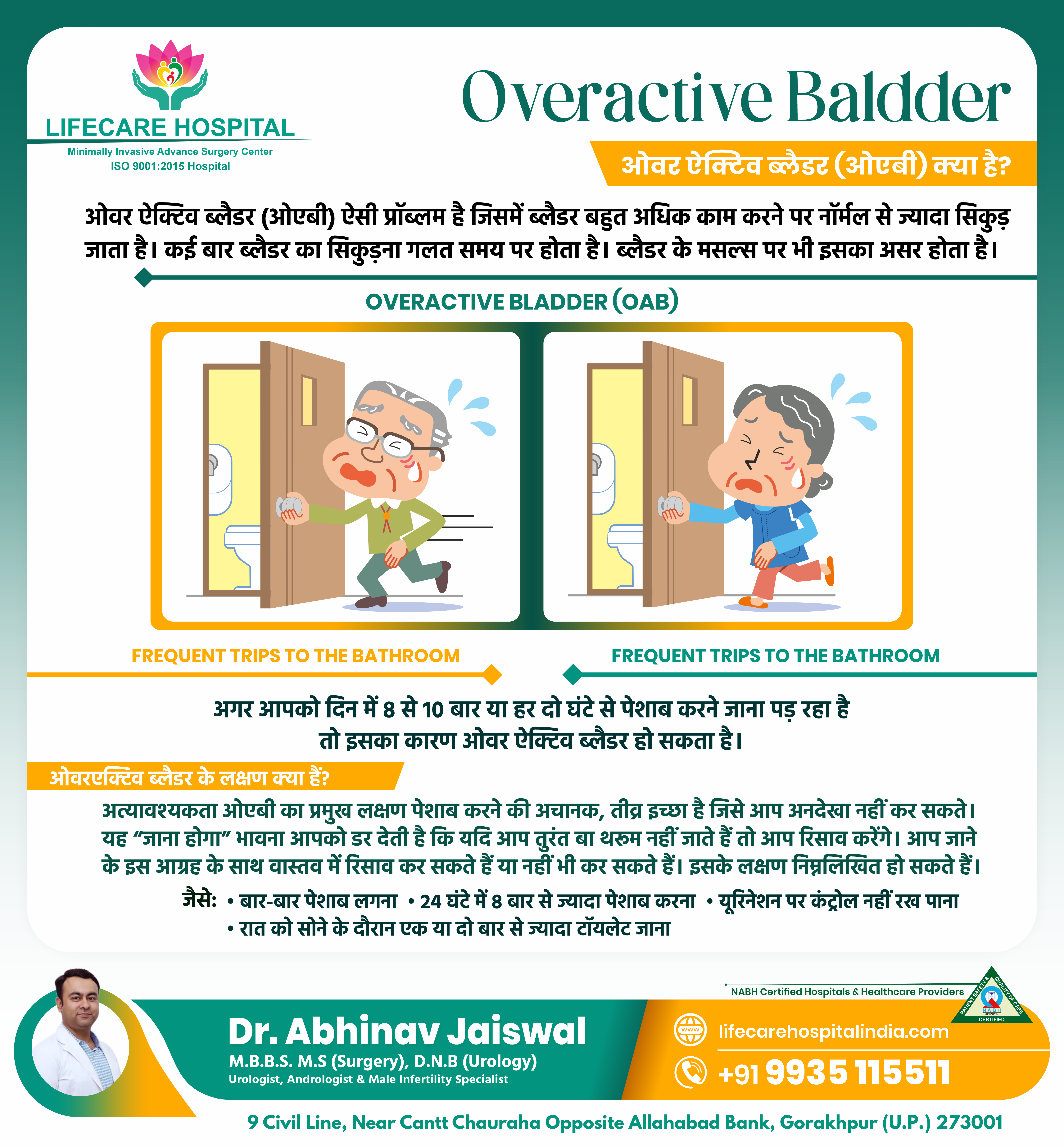 ओवर ऐक्टिव ब्लैडर (ओएबी) ऐसी प्रॉब्लम है जिसमें ब्लैडर बहुत अधिक काम करने पर नॉर्मल से ज्यादा सिकुड़ जाता है। कई बार ब्लैडर का सिकुड़ना गलत समय पर होता है। ब्लैडर के मसल्स पर भी इसका असर होता है।