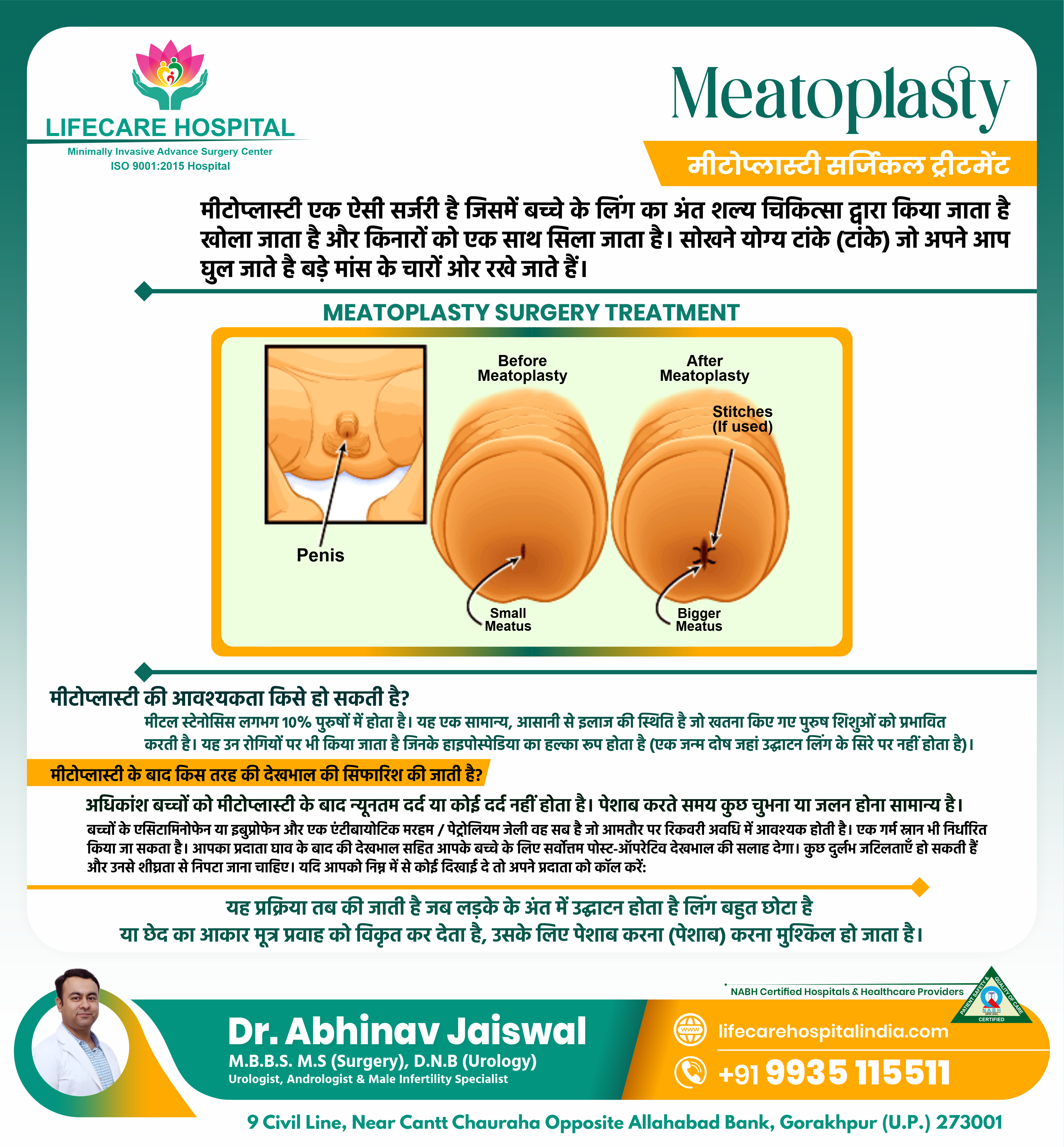 मीटोप्लास्टी एक ऐसी सर्जरी है जिसमें बच्चे के लिंग का अंत शल्य चिकित्सा द्वारा किया जाता है खोला जाता है और किनारों को एक साथ सिला जाता है। सोखने योग्य टांके (टांके) जो अपने आपघुल जाते है बड़े मांस के चारों ओर रखे जाते हैं।