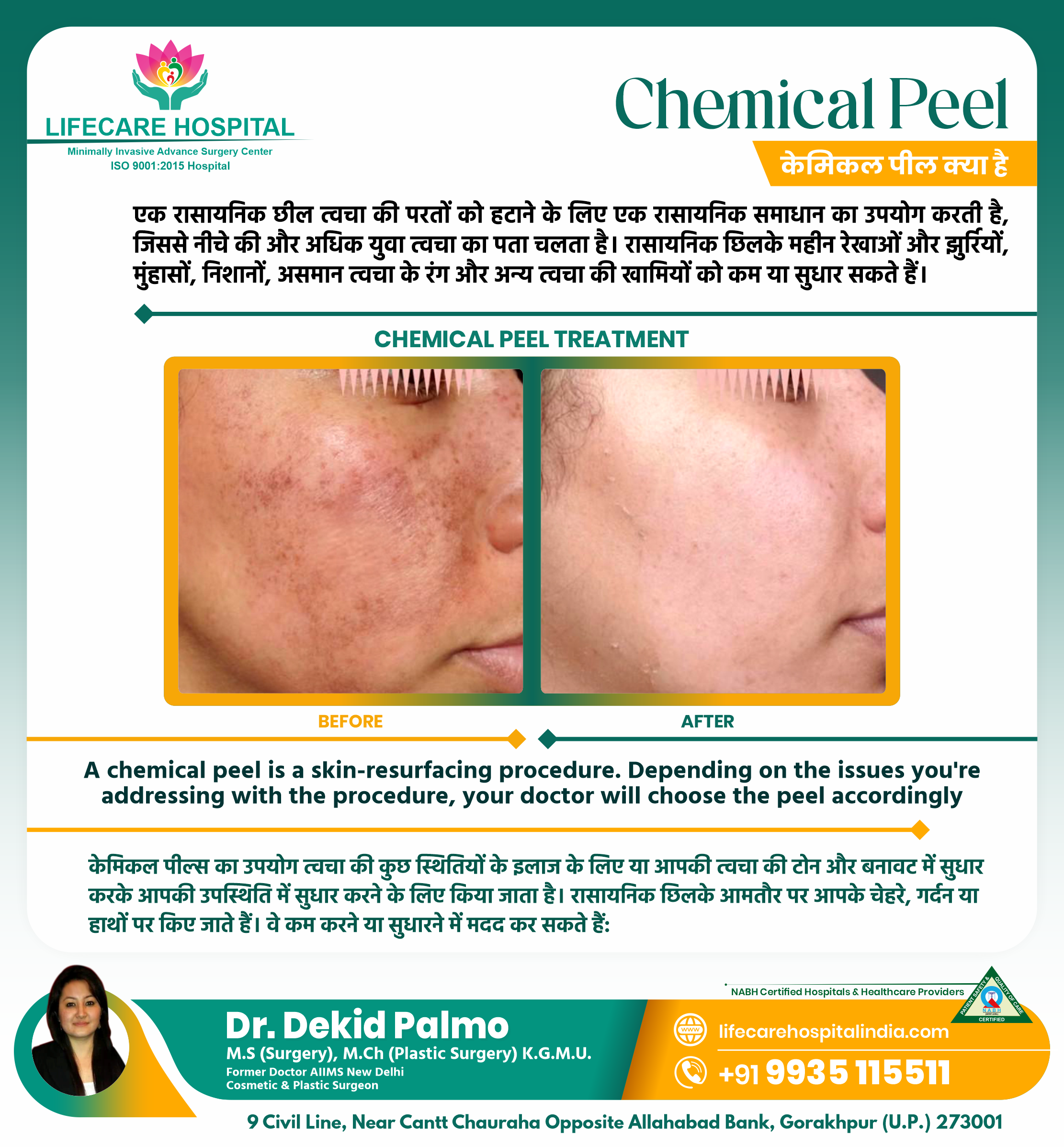 A chemical peel is a skin-resurfacing procedure. Depending on the issues you’readdressing with the procedure, your doctor will choose the peel accordingly.