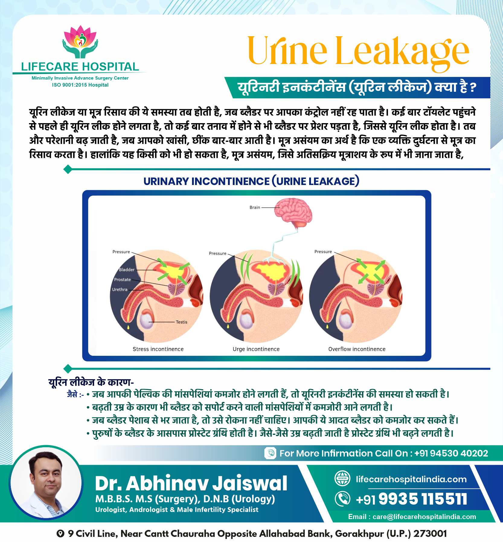 यूरिन लीकेज या मूत्र रिसाव की ये समस्या तब होती है, जब ब्लैडर पर आपका कंट्रोल नहीं रह पाता है। कई बार टॉयलेट पहुंचने से पहले ही यूरिन लीक होने लगता है, तो कई बार तनाव में होने से भी ब्लैडर पर प्रेशर पड़ता है, जिससे यूरिन लीक होता है। तब और परेशानी बढ़ जाती है, जब आपको खांसी, छींक बार-बार आती है। मूत्र असंयम का अर्थ है कि एक व्यक्ति दुर्घटना से मूत्र का रिसाव करता है। हालांकि यह किसी को भी हो सकता है, मूत्र असंयम, जिसे अतिसक्रिय मूत्राशय के रूप में भी जाना जाता है,