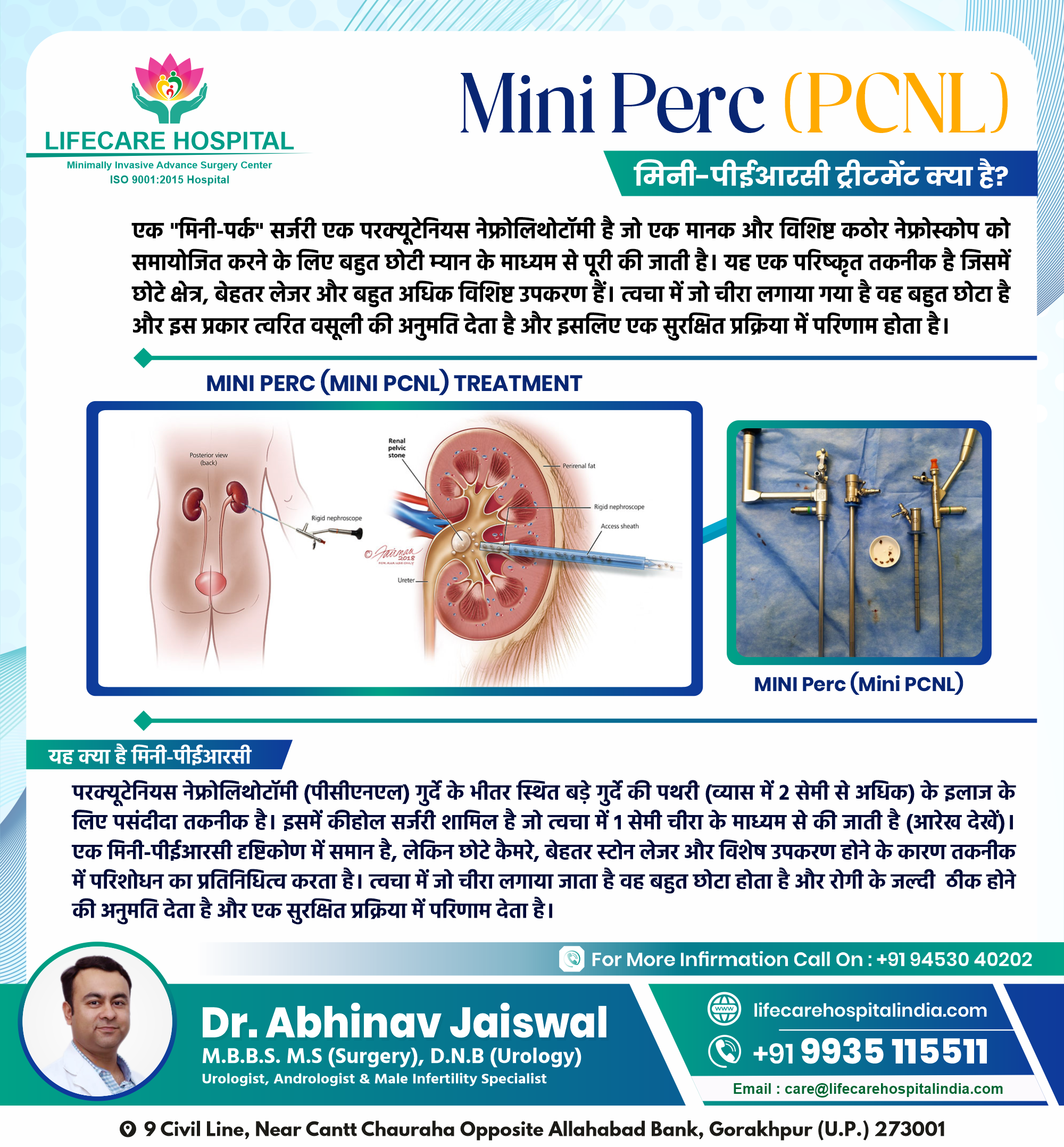 एक “मिनी-पर्क” सर्जरी एक परक्यूटेनियस नेफ्रोलिथोटॉमी है जो एक मानक और विशिष्ट कठोर नेफ्रोस्कोप को समायोजित करने के लिए बहुत छोटी म्यान के माध्यम से पूरी की जाती है। यह एक परिष्कृत तकनीक है जिसमें छोटे क्षेत्र, बेहतर लेजर और बहुत अधिक विशिष्ट उपकरण हैं। त्वचा में जो चीरा लगाया गया है वह बहुत छोटा है और इस प्रकार त्वरित वसूली की अनुमति देता है और इसलिए एक सुरक्षित प्रक्रिया में परिणाम होता है।