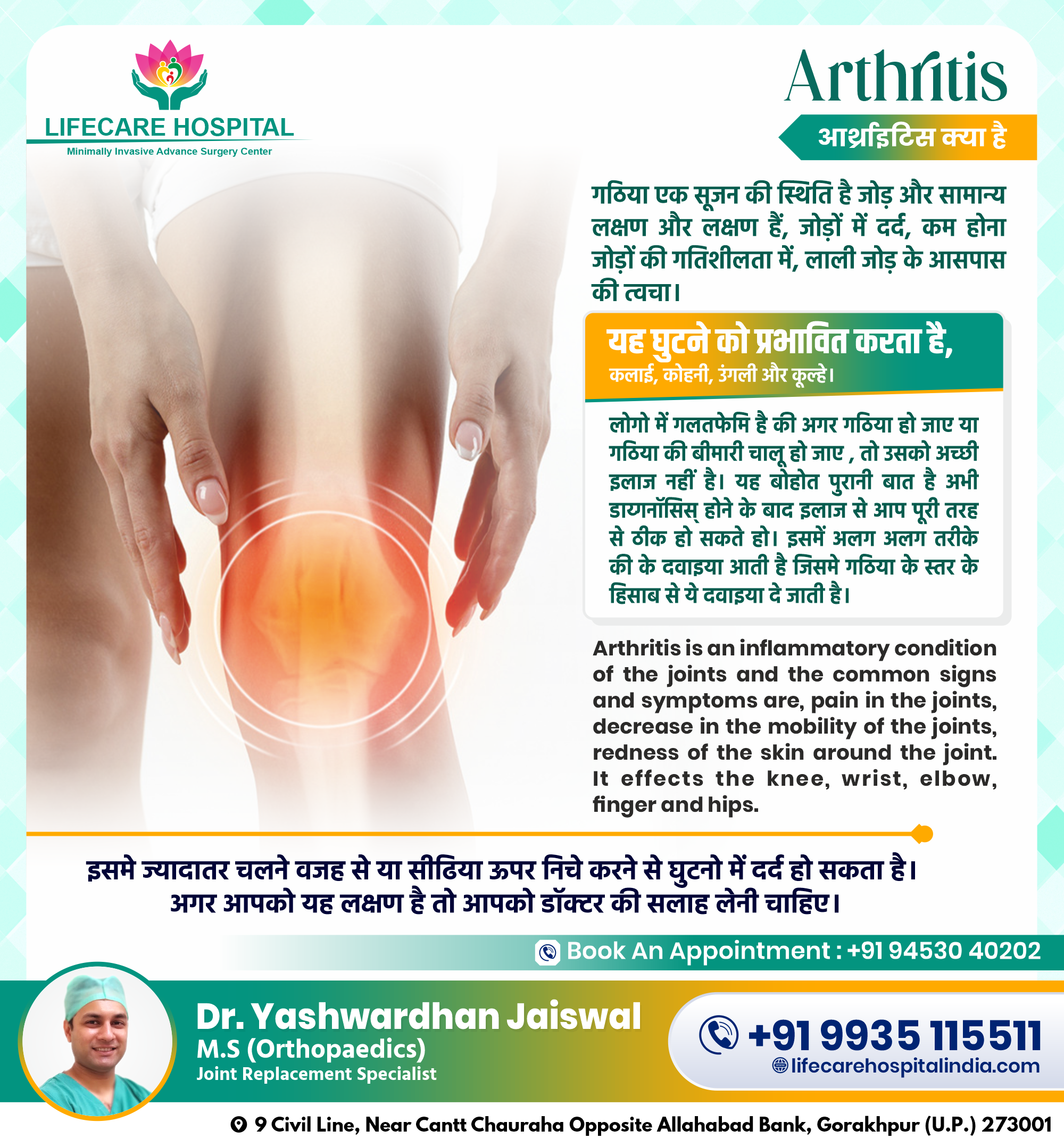 Arthritis is an inflammatory condition of the joints and the common signs and symptoms are, pain in the joints, decrease in the mobility of the joints, redness of the skin around the joint. It effects the knee, wrist, elbow, finger and hips.