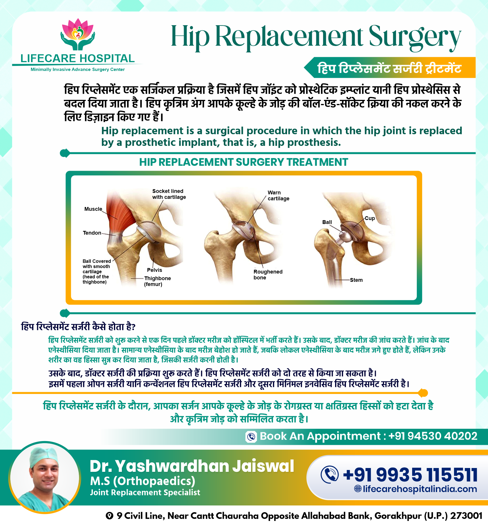 हिप रिप्लेसमेंट एक सर्जिकल प्रक्रिया है जिसमें हिप जॉइंट को प्रोस्थेटिक इम्प्लांट यानी हिप प्रोस्थेसिस से बदल दिया जाता है। हिप कृत्रिम अंग आपके कूल्हे के जोड़ की बॉल-एंड-सॉकेट क्रिया की नकल करने के लिए डिज़ाइन किए गए हैं।