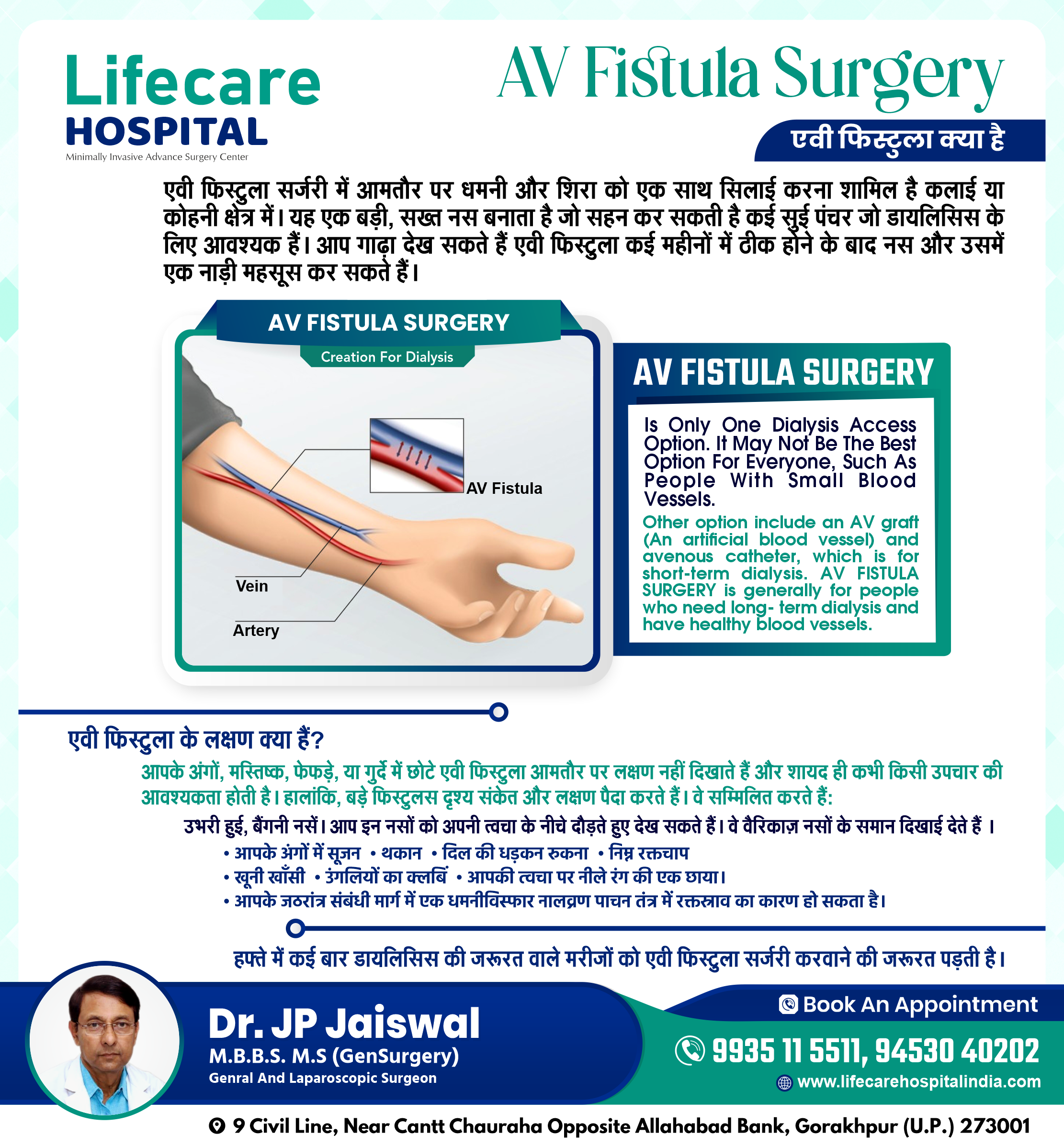 Other option include an AV graft (An artificial blood vessel) and avenous catheter, which is for short-term dialysis. AV FISTULA SURGERY is generally for people who need long- term dialysis and have healthy blood vessels.