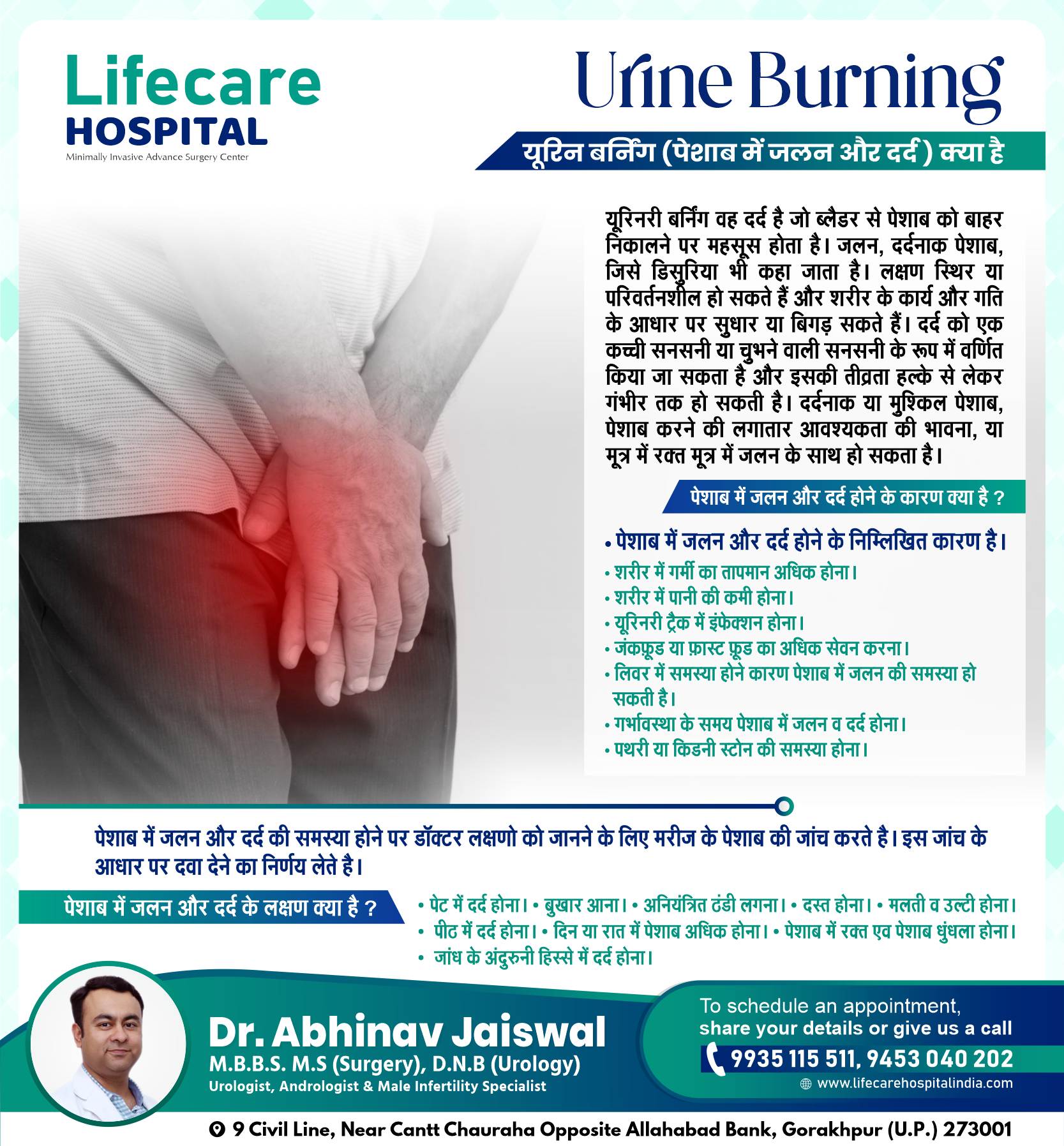 यूरिनरी बर्निंग वह दर्द है जो ब्लैडर से पेशाब को बाहर निकालने पर महसूस होता है। जलन, दर्दनाक पेशाब, जिसे डिसुरिया भी कहा जाता है। लक्षण स्थिर या परिवर्तनशील हो सकते हैं और शरीर के कार्य और गति के आधार पर सुधार या बिगड़ सकते हैं। दर्द को एक कच्ची सनसनी या चुभने वाली सनसनी के रूप में वर्णित किया जा सकता है और इसकी तीव्रता हल्के से लेकर गंभीर तक हो सकती है। दर्दनाक या मुश्किल पेशाब, पेशाब करने की लगातार आवश्यकता की भावना, या मूत्र में रक्त मूत्र में जलन के साथ हो सकता है।