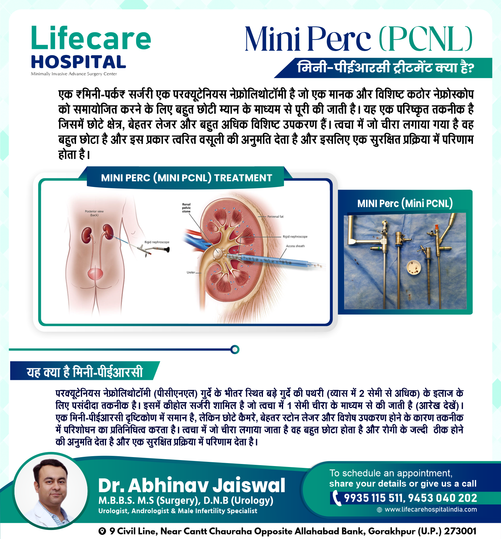 एक “मिनी-पर्क” सर्जरी एक परक्यूटेनियस नेफ्रोलिथोटॉमी है जो एक मानक और विशिष्ट कठोर नेफ्रोस्कोप को समायोजित करने के लिए बहुत छोटी म्यान के माध्यम से पूरी की जाती है। यह एक परिष्कृत तकनीक है जिसमें छोटे क्षेत्र, बेहतर लेजर और बहुत अधिक विशिष्ट उपकरण हैं। त्वचा में जो चीरा लगाया गया है वह बहुत छोटा है और इस प्रकार त्वरित वसूली की अनुमति देता है और इसलिए एक सुरक्षित प्रक्रिया में परिणाम होता है।
