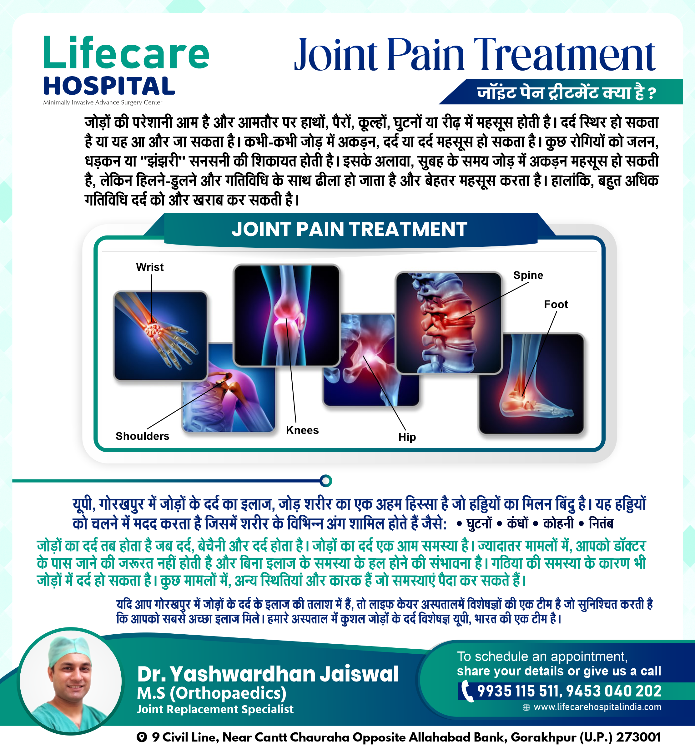 यदि आप गोरखपुर में जोड़ों के दर्द के इलाज की तलाश में हैं, तो लाइफ केयर अस्पताल में विशेषज्ञों की एक टीम है जो सुनिश्चित करती है कि आपको सबसे अच्छा इलाज मिले। हमारे अस्पताल में कुशल जोड़ों के दर्द विशेषज्ञ यूपी, भारत की एक टीम है।